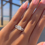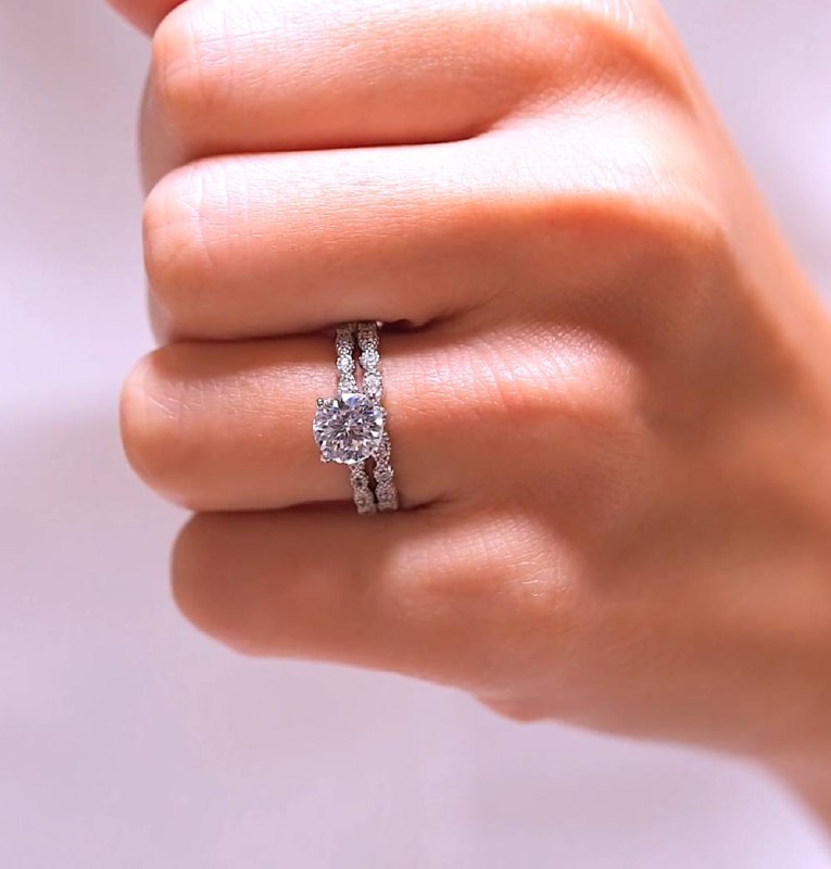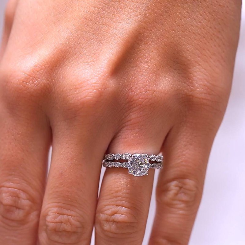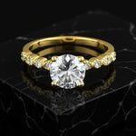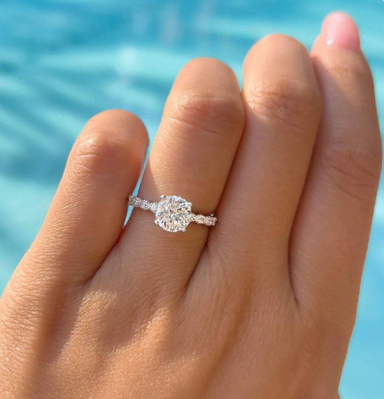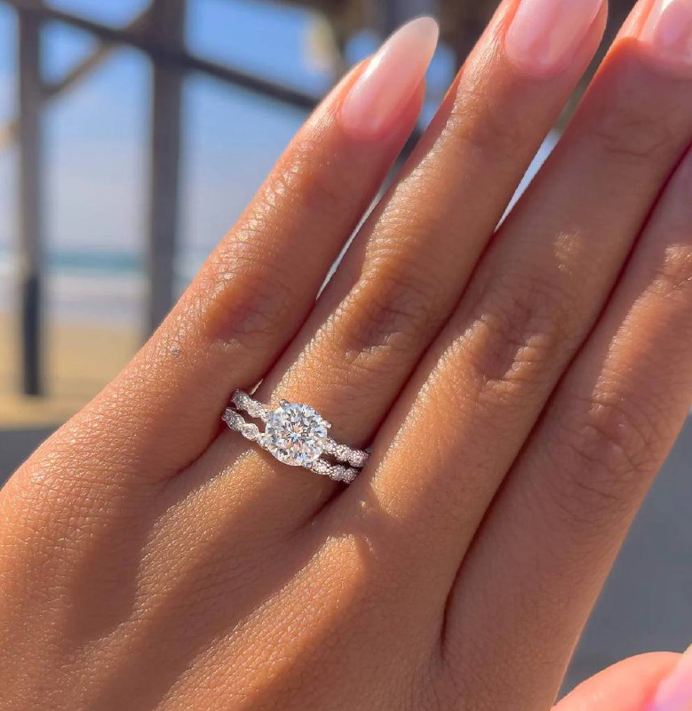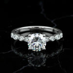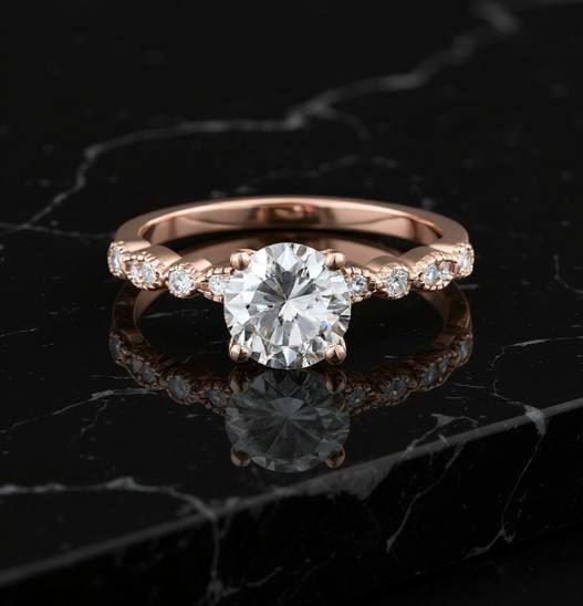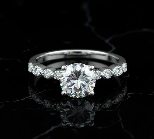 Surrounding Detail: The ring features a row of smaller diamonds flanking the large center stone on both sides. These accent stones add extra sparkle and elegance to the overall look.