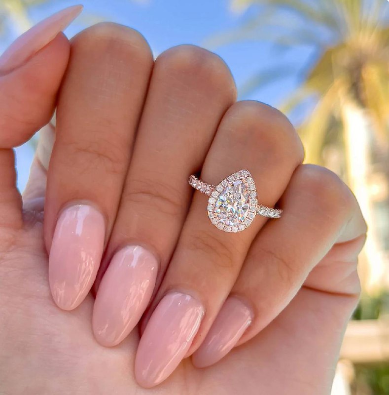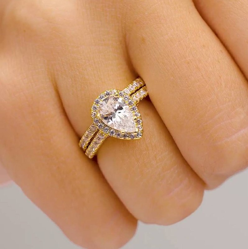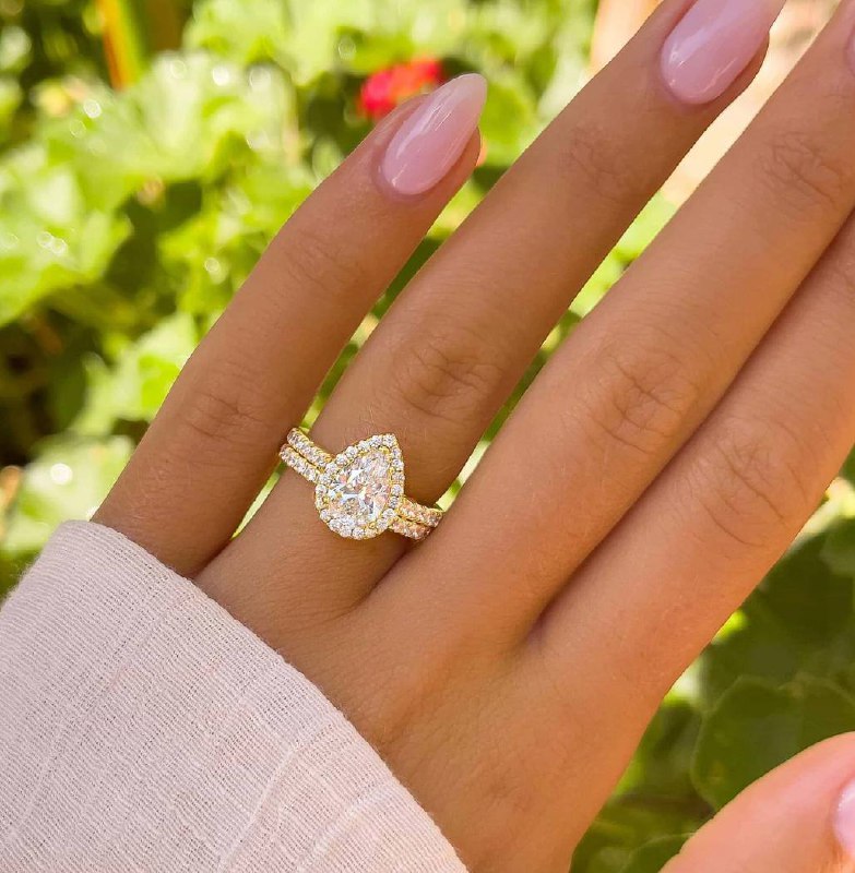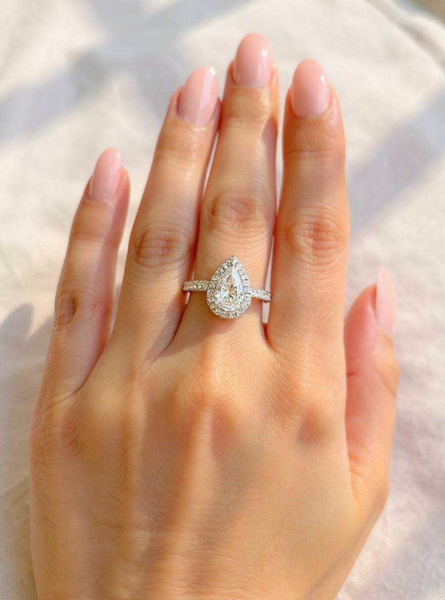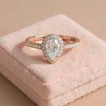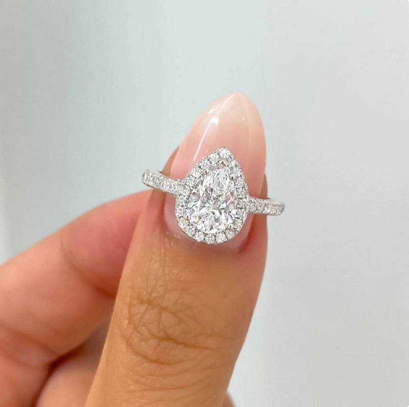 Surrounding Detail: At the heart of the ring lies a stunning pear-shaped diamond, framed by a halo of smaller round diamonds that amplify its fire and brilliance. The halo setting accentuates the teardrop shape, creating a luxurious and eye-catching focal point.