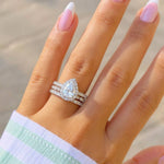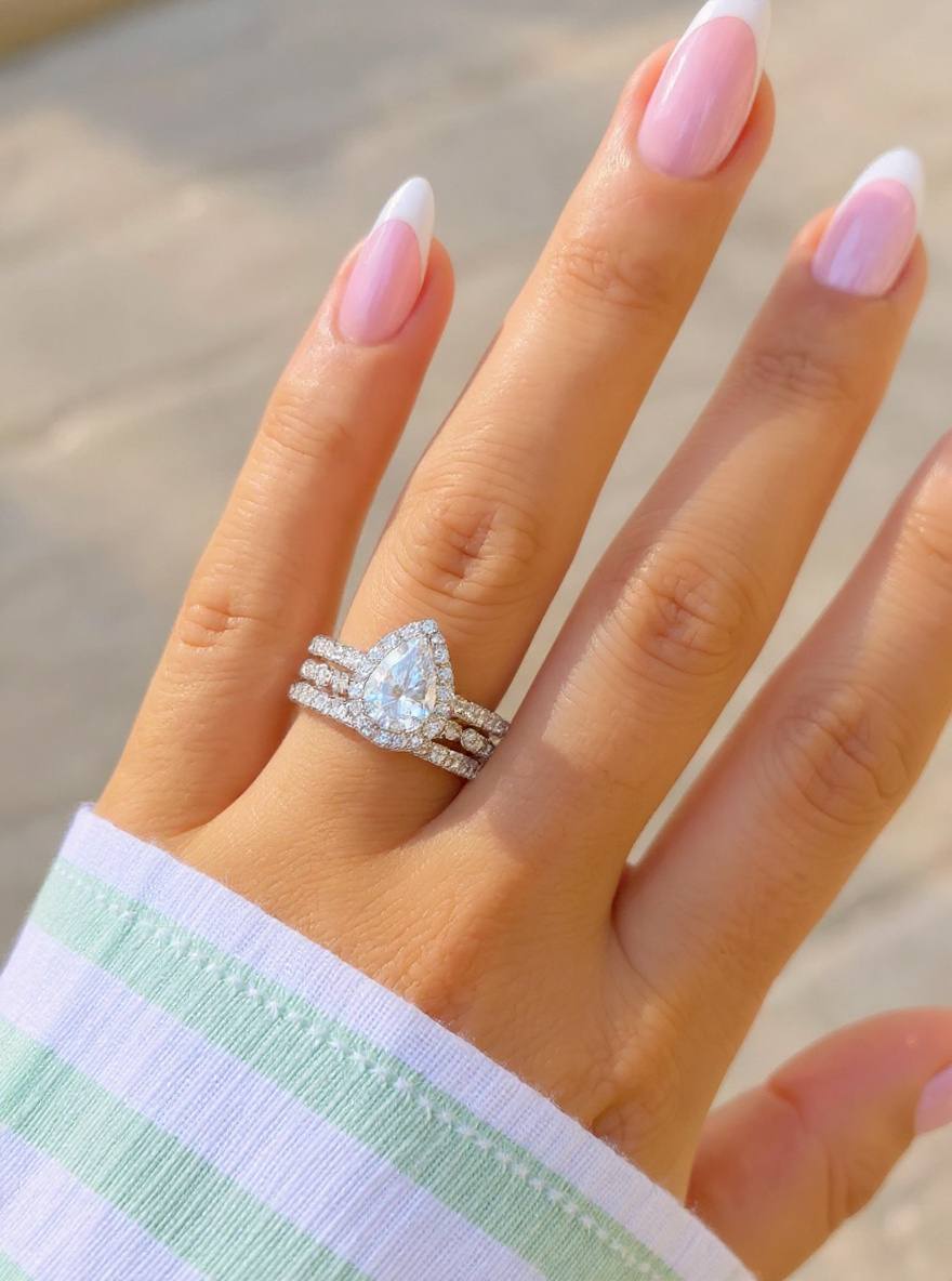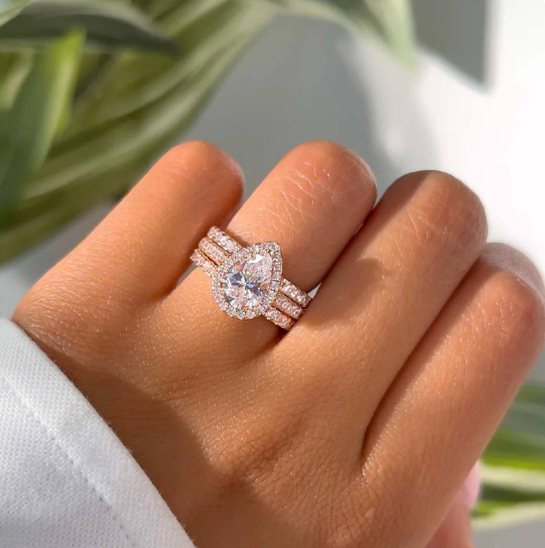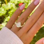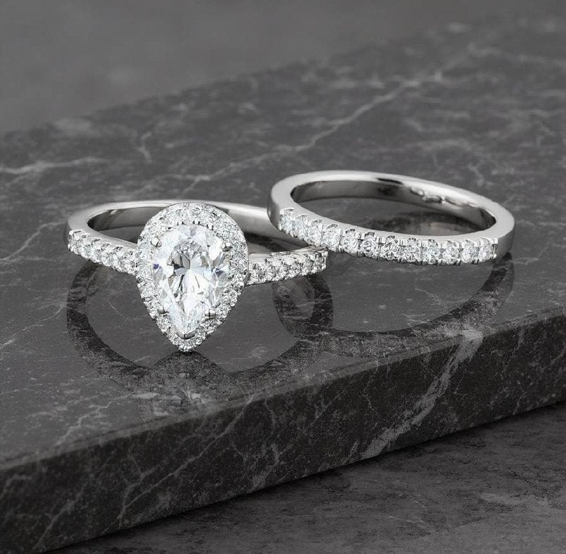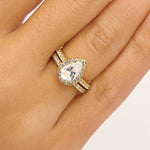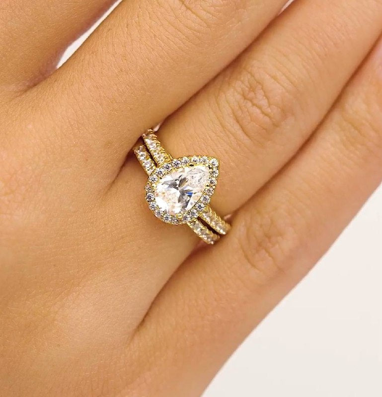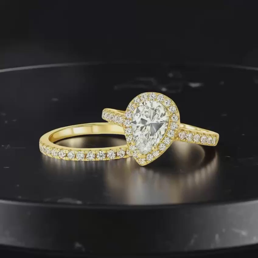 Surrounding Detail: At the heart of the ring lies a stunning pear-shaped diamond, framed by a halo of smaller round diamonds that amplify its fire and brilliance. The halo setting accentuates the teardrop shape, creating a luxurious and eye-catching focal point.